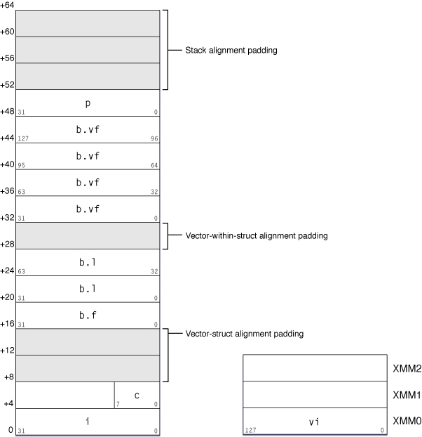 __m128,__m128d, and__m128i) in registers XMM0 through XMM3). When the usable XMM registers are exhausted, the caller places 128-bit vectors in the parameter area. The caller aligns 128-bit vectors in the parameter area to 16-byte boundaries.