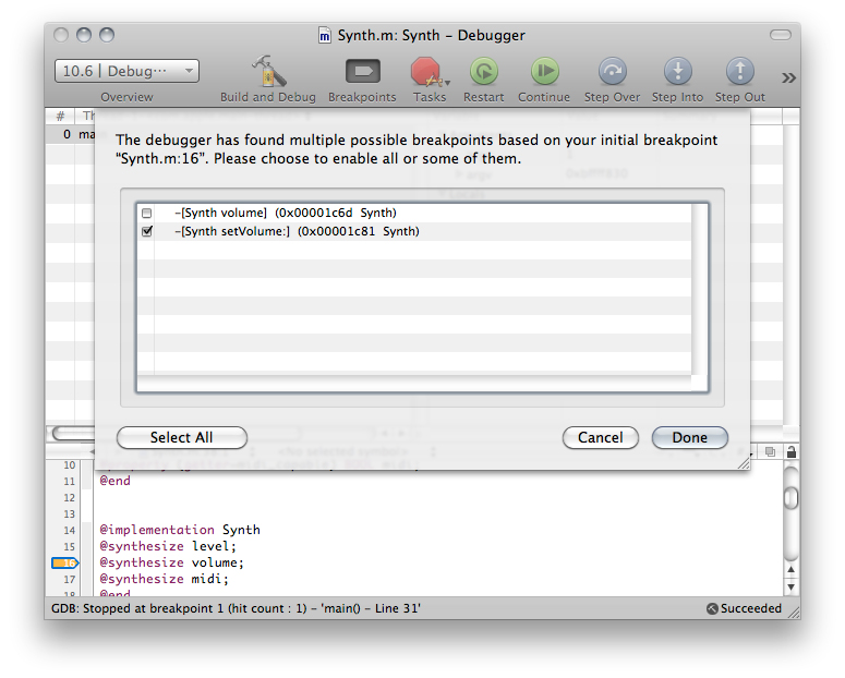 A more convenient way of setting breakpoints on synthesized accessors is to set the breakpoint on the code line with the @synthesize directive. If the program is being debugged, (or the next time you start a debugging session on it), Xcode asks you to identify the methods to which you want to add a breakpoint, as shown in Figure 7-2. Xcode remembers your selections in subsequent debugging sessions.