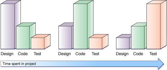 As you iterate through the development process, notice how your time is divided among the three phases varies. For example, at the beginning of the project, you have an idea, but no code to write or test, so more of your time is spent on design decisions. As you get ready to ship your app, your designs are mostly complete, you are changing the code only where necessary to fix problems, and you are spending the majority of your time testing to verify that your app works correctly and that users love it.