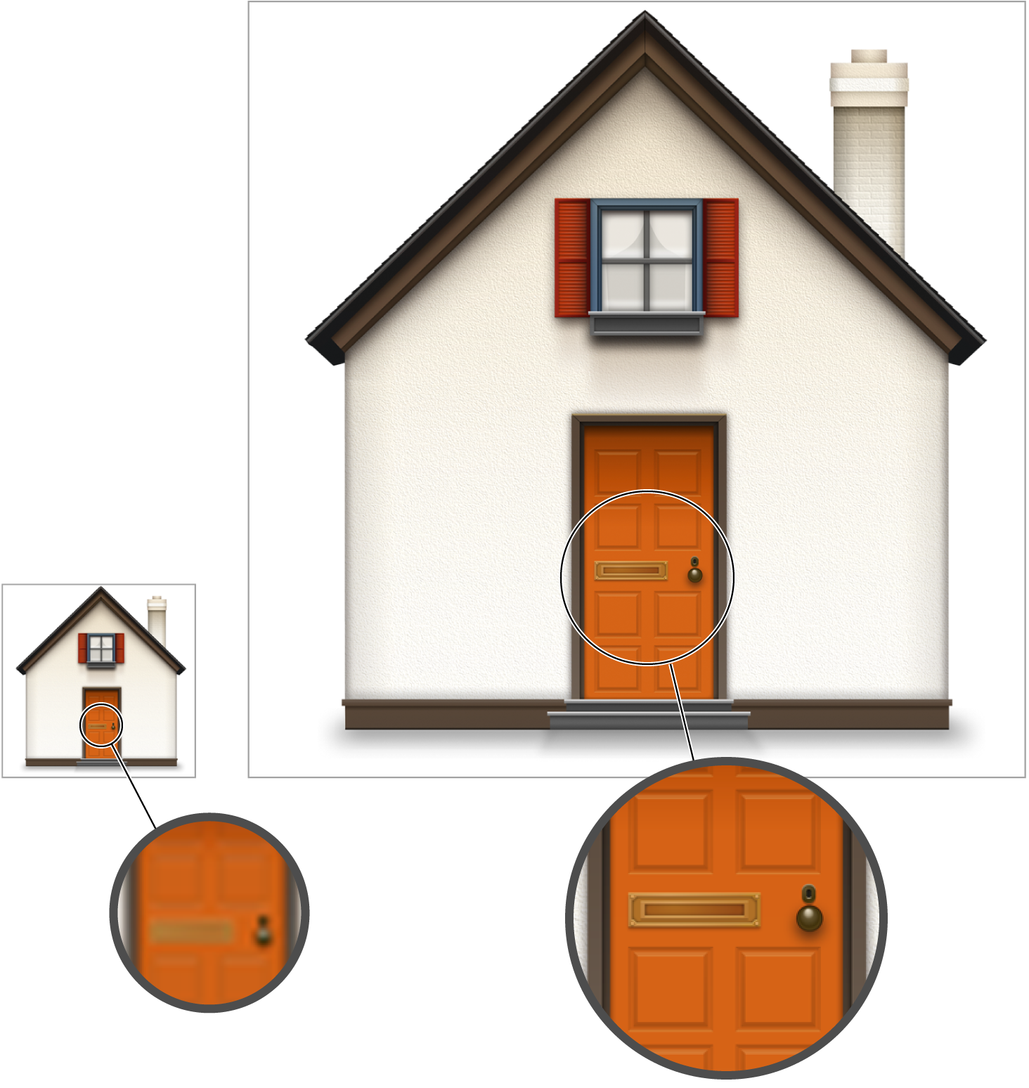 For new icons, it’s easiest to design the large icons first and then decide how to scale them down. When scaling up existing icons, the enlarged versions should look like close-ups of the existing icons, with the appropriate level of detail. For example, a house icon could show shingles or shutters in the larger sizes, while a large book icon might actually contain readable text. Do not simply create a pixel-for-pixel upscaled version of the existing icon. Figure 2-1 shows the changes in detail for different icon sizes. The larger icon has much more detail; you can see the bolts holding the mail slot on the door.