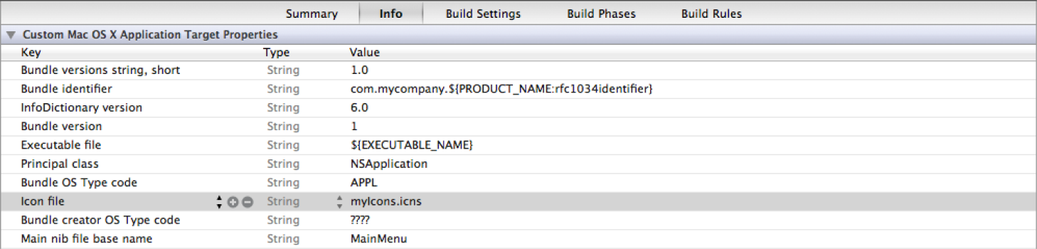 After creating the icns file, enter the filename in Xcode for the Icon file key located in Custom OS X Application Target Properties.