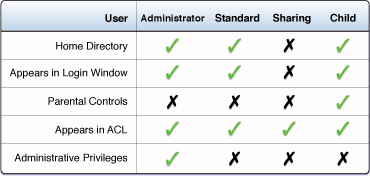 A user is an identity that has authentication credentials. There are two forms of credentials: a traditional password, and a certificate. A user can be added to ACLs to access files or services. There are four different types of users: administrators, standard, child, and sharing. The list of user types and their features is available in Figure 1-3.