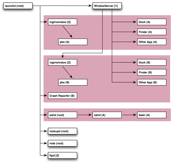 WindowServerprocess that resides in the global bootstrap namespace. However, the window server knows about all GUI per-session bootstrap namespaces. In this case, there's a GUI per-session bootstrap namespace for user A's login session, and another for user B's.All applications are children of window server, which does the work to ensure that they run in the correct bootstrap namespace.