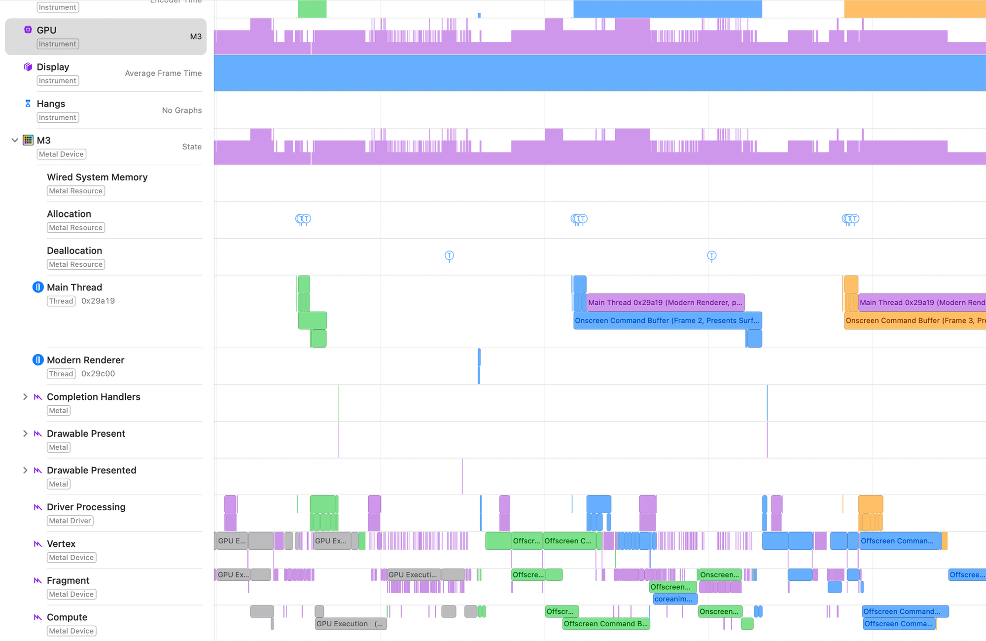 The Metal system trace template in Instruments provides a visual timeline of the parallel work on the CPU, GPU, and the memory usage of your Metal app.