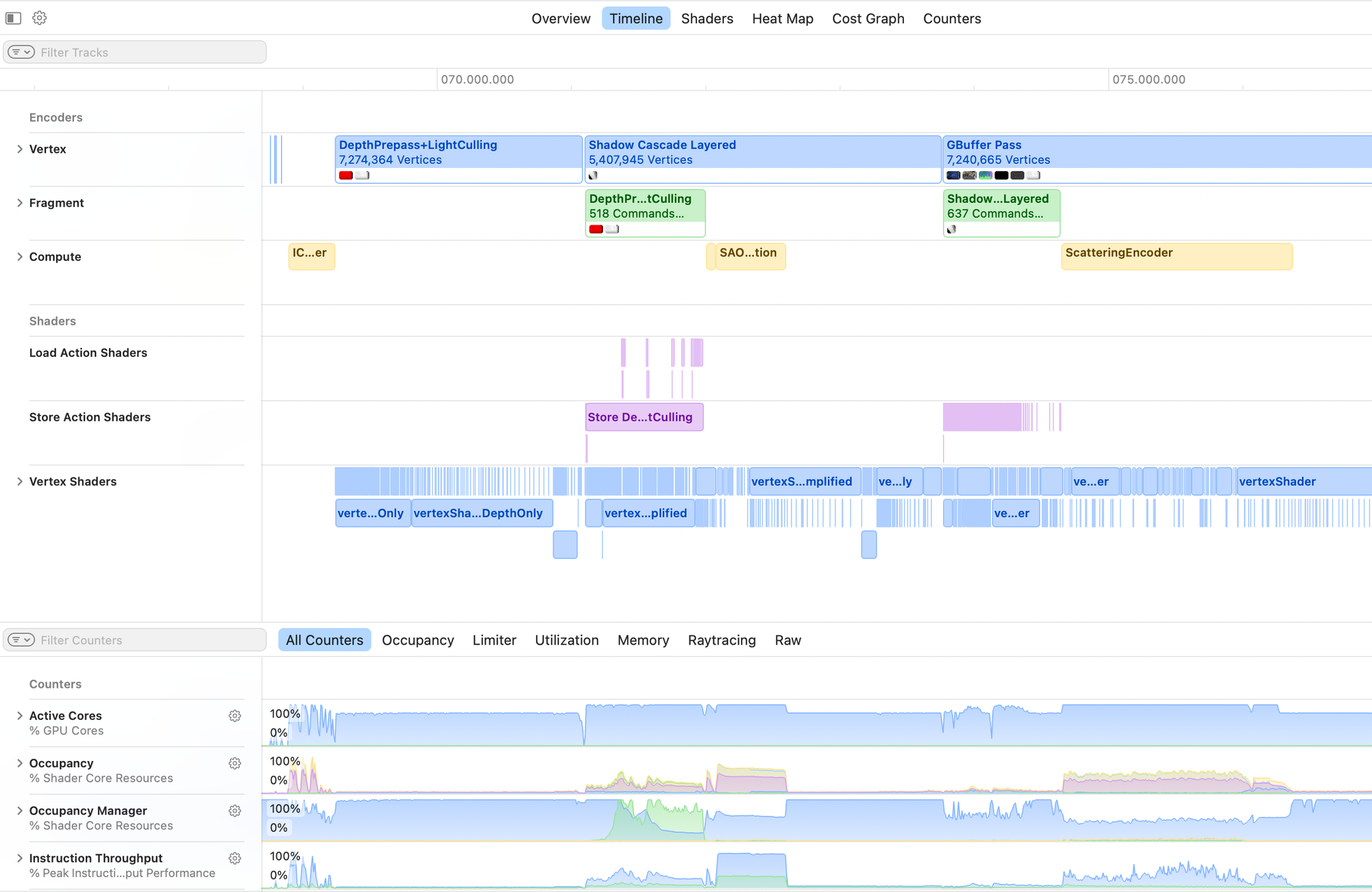 The performance timeline in Xcode displays the various passes and stages running simultaneously, along with hardware counters. You can discover over-serialization by observing non-overlapping GPU work.