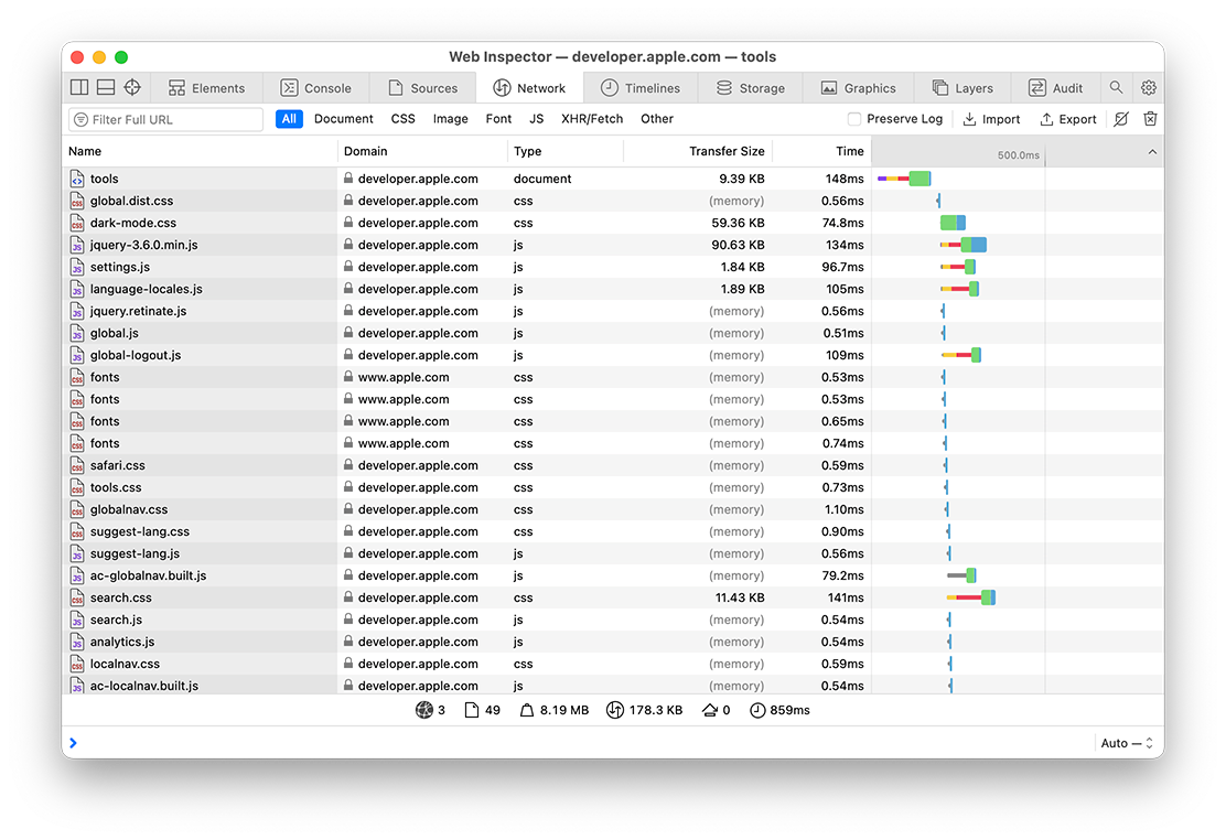 Network. See a detailed list of all network requests made to load every web page resource, so you can quickly evaluate the response, status, timing, and more.