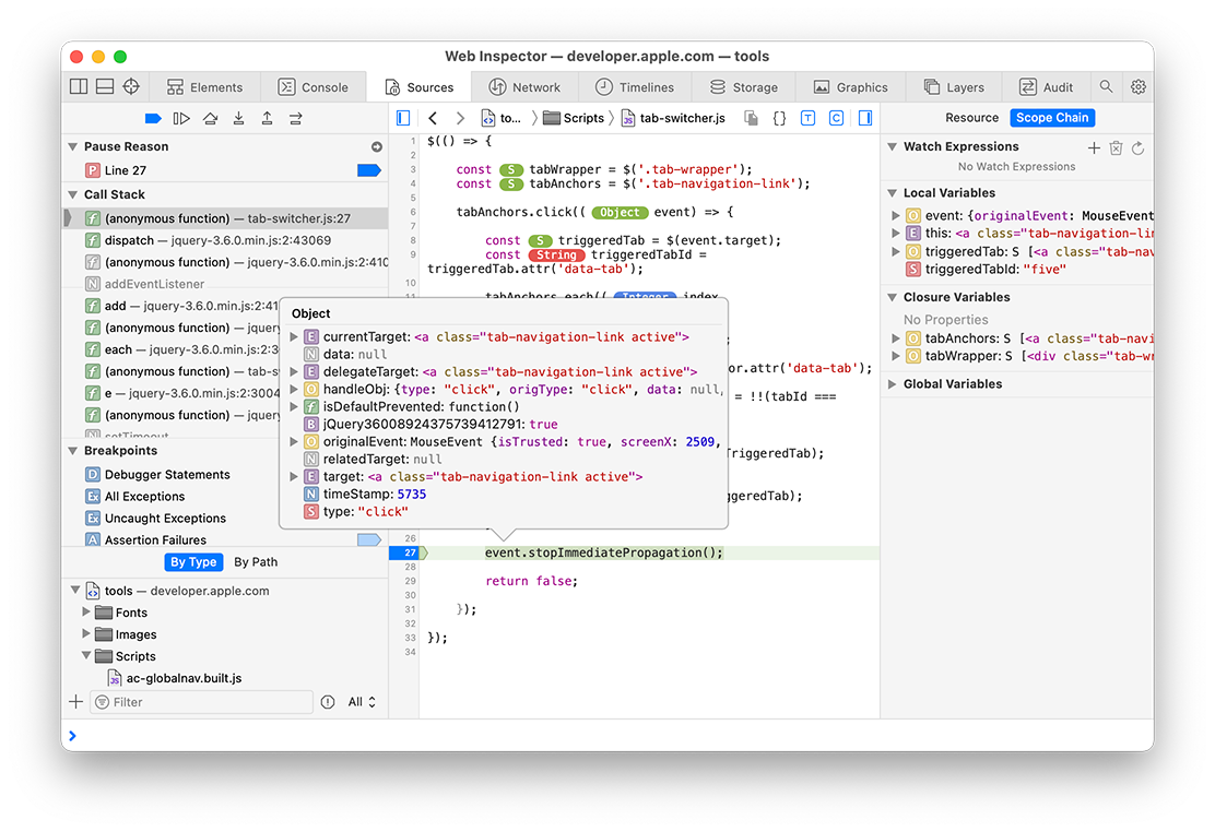Sources. Find every resource of a webpage, including documents, images, scripts, stylesheets, and more. Use the built-in debugger with data type and code highlights to troubleshoot and understand the script execution flow.