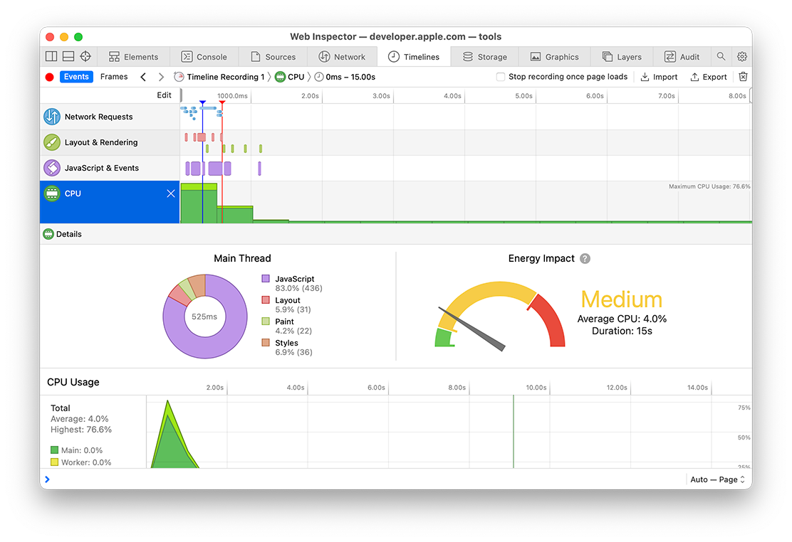 Timelines. Understand all the activity that occurs on an open web page, such as network requests, layout and rendering, JavaScript events, memory, and CPU impact. Everything is neatly plotted on a timeline or recored by frame, helping you discover ways to optimize your site.