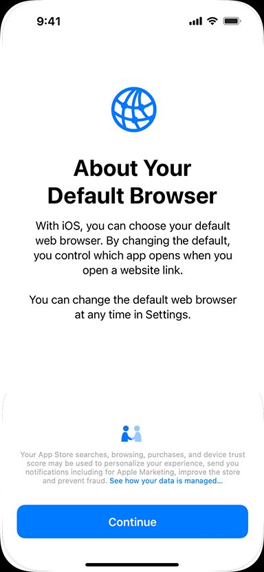 To meet the requirements in the Digital Markets Act (DMA) in the European Union, iOS and iPadOS include a choice screen that provides an additional way to choose a default web browser from a list of options. The screen is displayed the first time a user in the EU opens Safari on their iPhone or iPad running a minimum of iOS 17.4 or iPadOS 18.2.