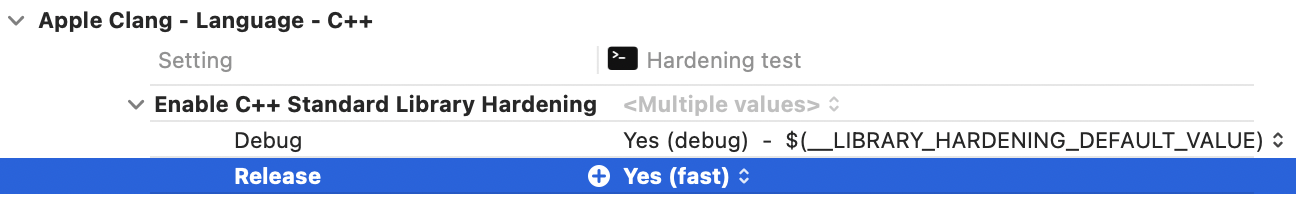 Starting in Xcode 16, the C++ standard library supports hardening. Turning on hardening enables checks for common cases of misuse of the standard library; if a check fails, the program is reliably terminated, helping prevent security vulnerabilities and diagnose some cases of undefined behavior.